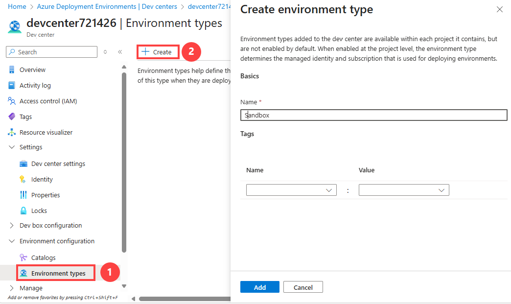 4. In the Create environment type pane, enter the following information, and then select Add:
