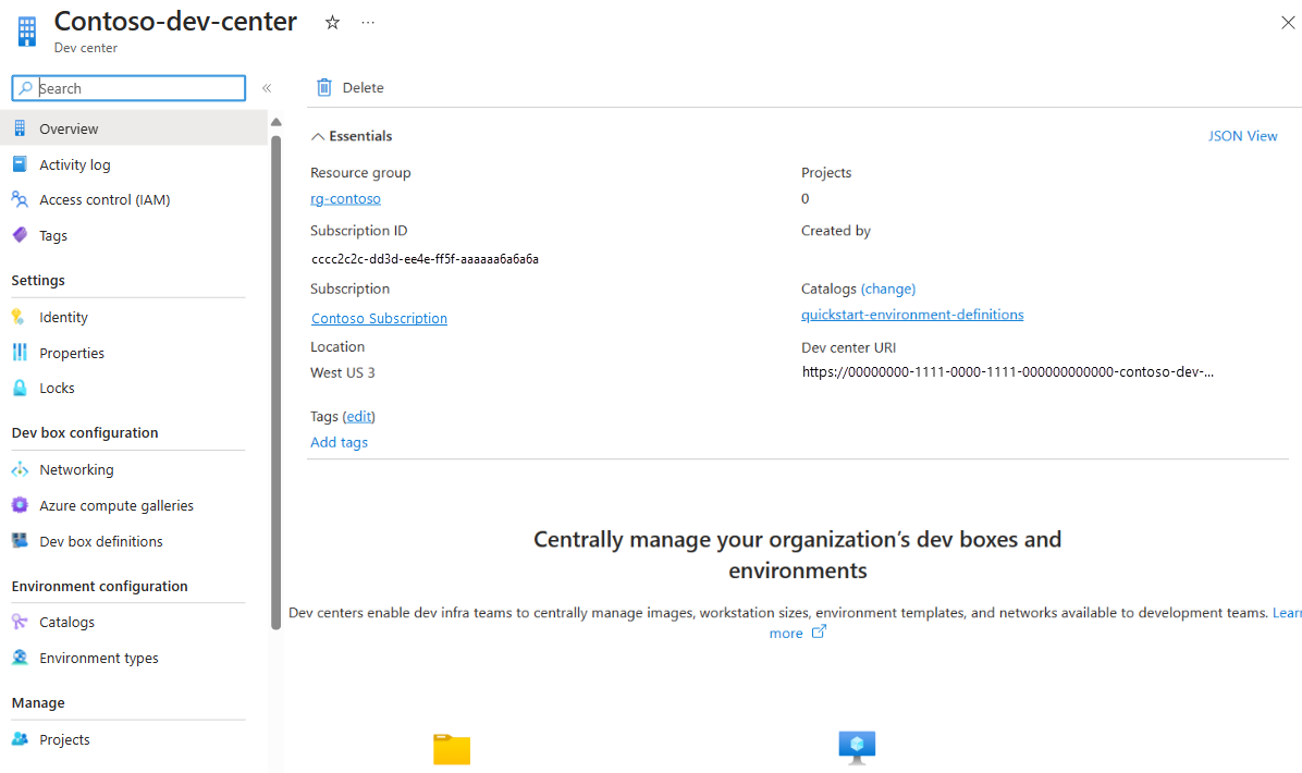 In this quickstart, you created a dev center and configured it with an identity, a catalog, and an environment type. You then created a project and granted project access to your development team. To learn about how your development team members can create environments, go to the next quickstart.