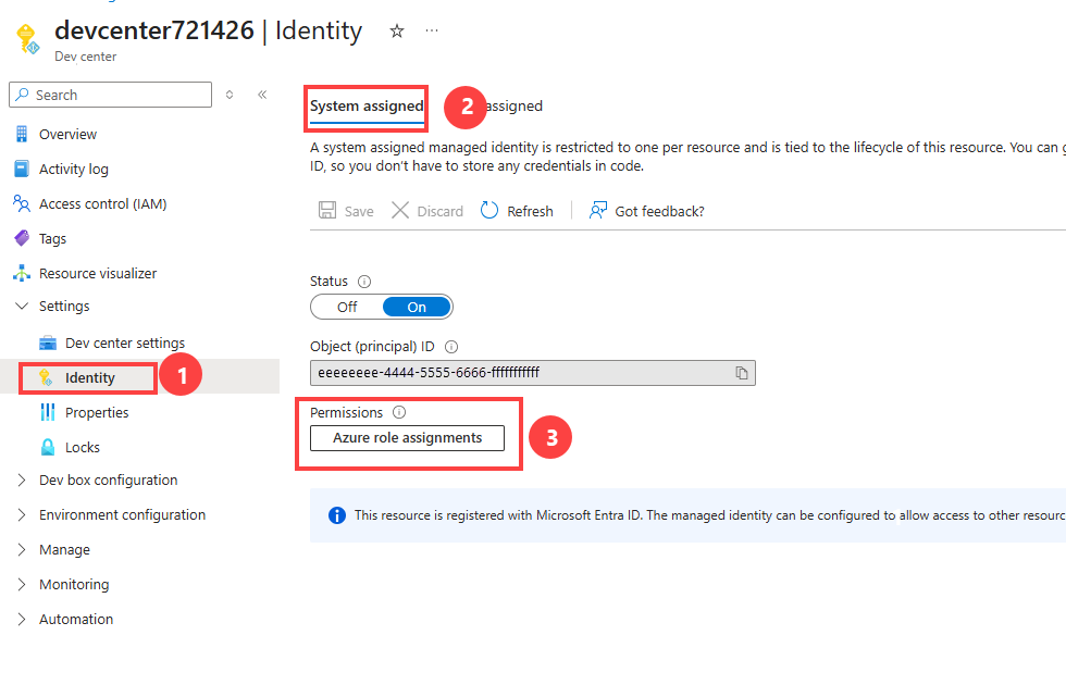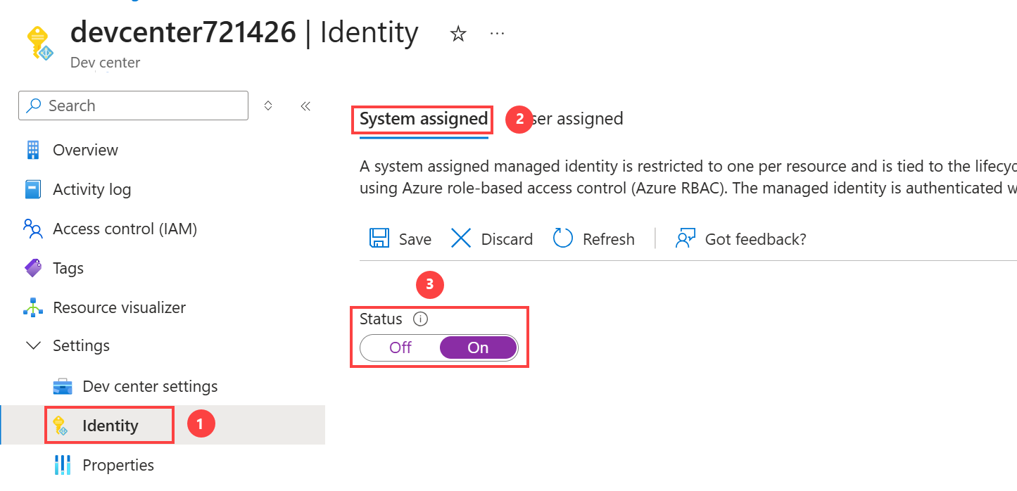 To attach a system-assigned managed identity to your dev center:
