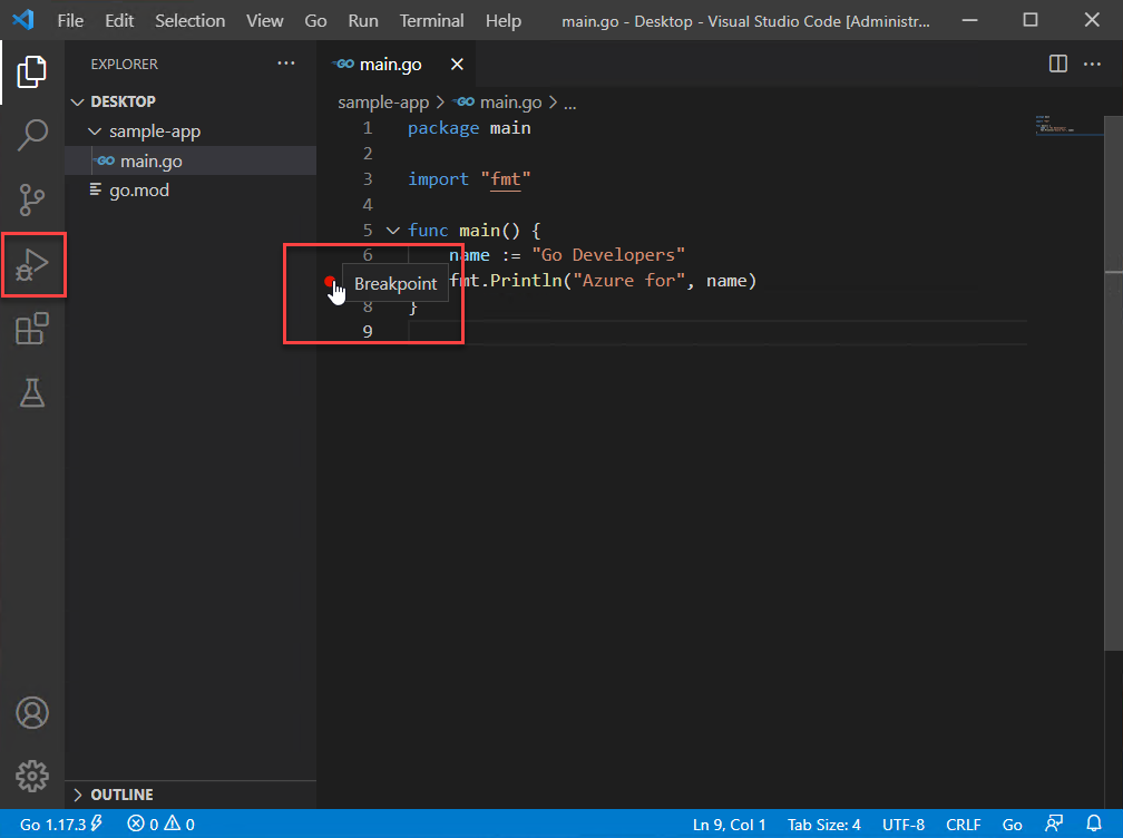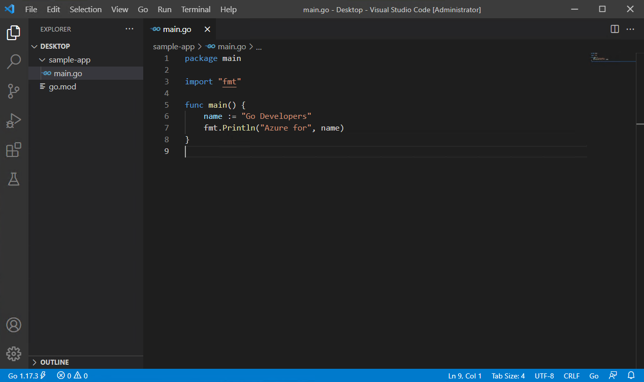 In this quickstart, you install the Go compiler and tools, install Visual Studio Code to write Go code, and install the Go for Visual Studio Code extension which provides support while writing Go. Once configured, you create an application, run it, and use the debugging tool to pause execution and observe the value of variables.