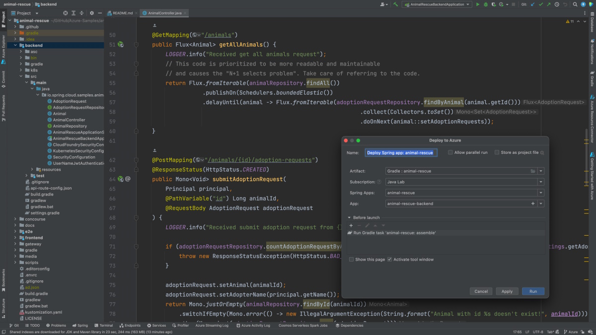 Screenshot of IntelliJ that shows a Java file and the Deploy to Azure dialog box.