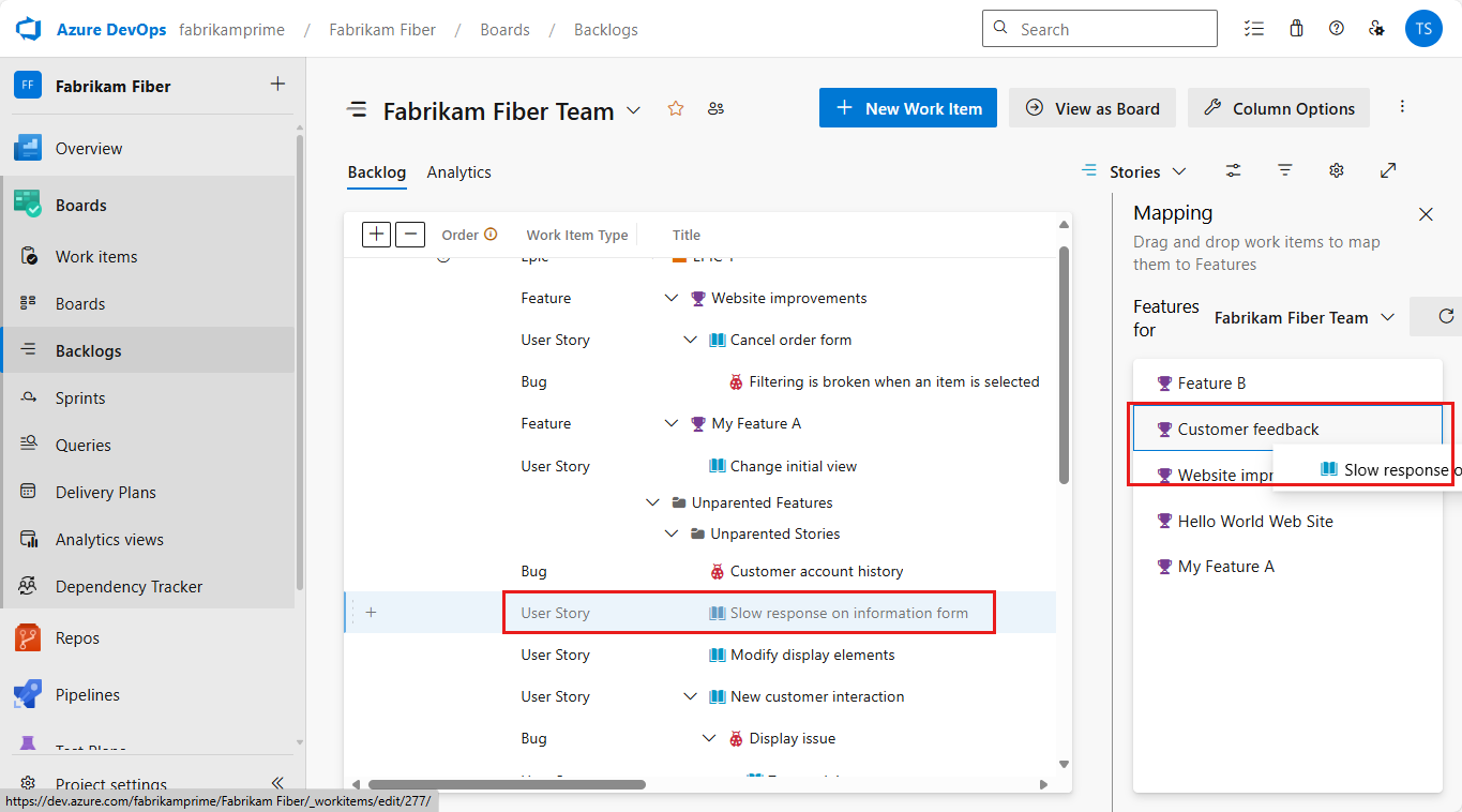 In this tutorial, you learn how to organize your backlog in Azure Boards. After you add features or epics to your portfolio backlog, you can map backlog items. You can add and group items into a hierarchy. Also, drill up or down in the hierarchy, reorder and reparent items, and filter hierarchical views.