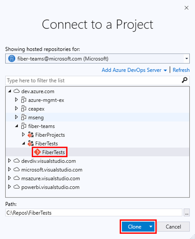 In the Clone a repository window, enter the remote repo location and the folder path for the cloned repo. If you don't know the remote repo location, select Azure DevOps from Browse a repository options.