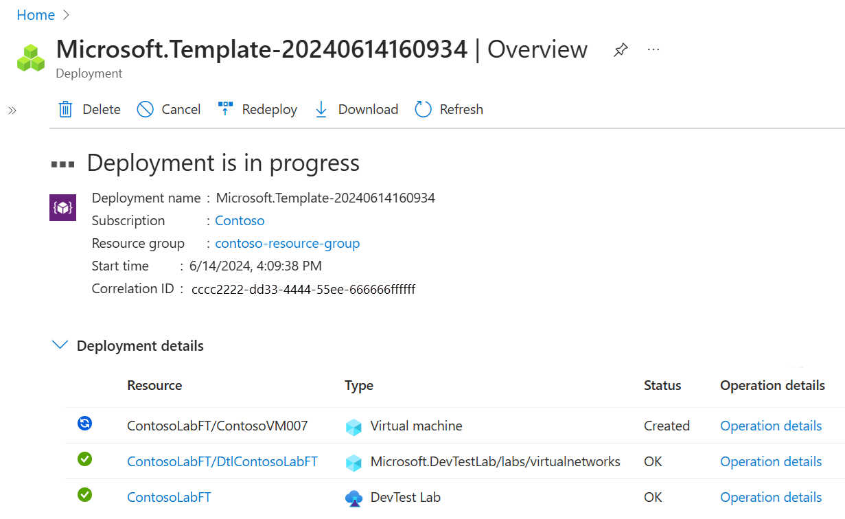 During deployment, you can monitor the deployment progress on the template Overview page: