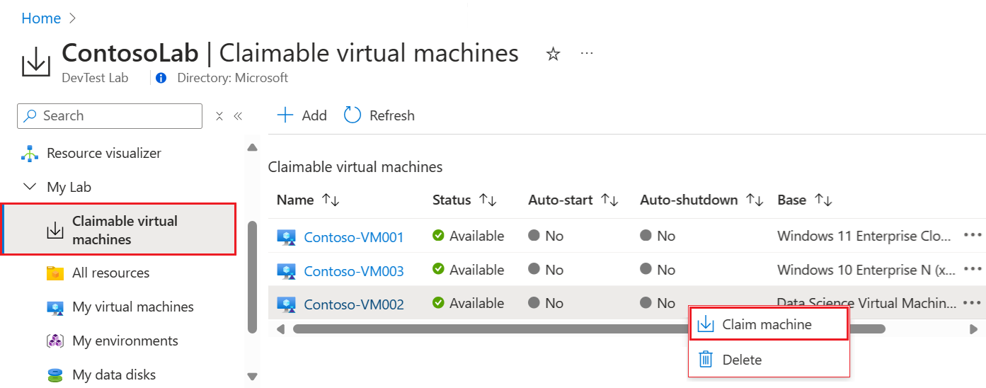 On the lab Overview page, expand the My lab section on the left menu, and select Claimable virtual machines.