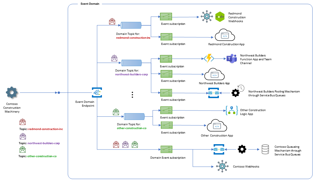 Event domains are most easily explained using an example. Let's say you run Contoso Construction Machinery, where you manufacture tractors, digging equipment, and other heavy machinery. As a part of running the business, you push real-time information to customers about equipment maintenance, systems health, and contract updates. All of this information goes to various endpoints including your app, customer endpoints, and other infrastructure that your customers have set up.