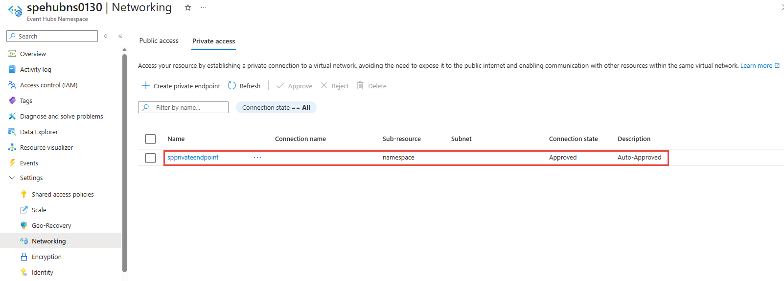 - You should see the status of the private endpoint connection in the list changed to Approved.