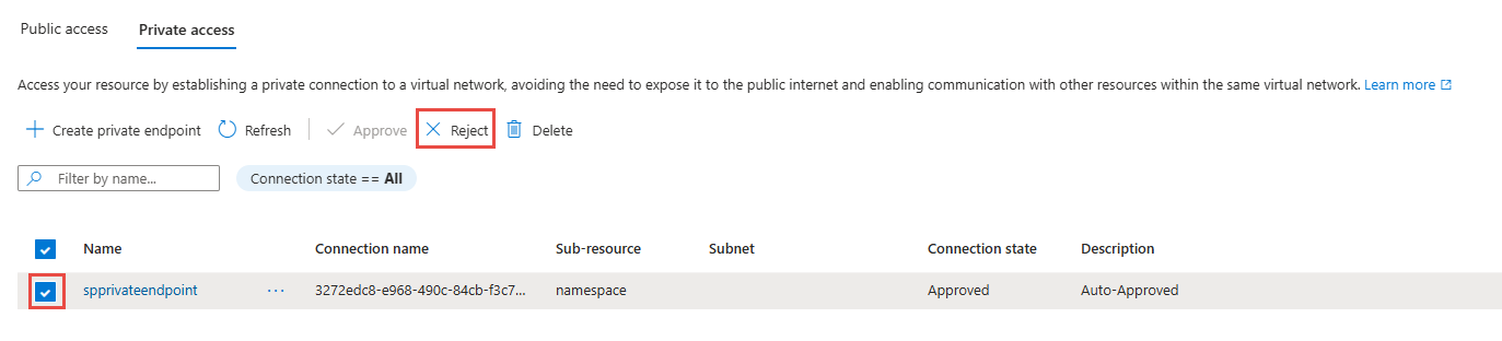 If there are any private endpoint connections you want to reject, whether it's a pending request or existing connection, select the connection and select the Reject button.