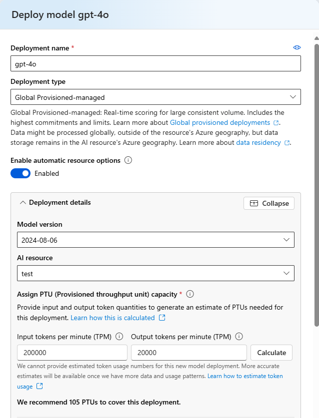 Choose a model, and click Confirm. Select a provision throughput deployment type. After filling out the input and output TPM data in the built-in capacity calculator, select the Calculate button to view your PTU allocation recommendation.