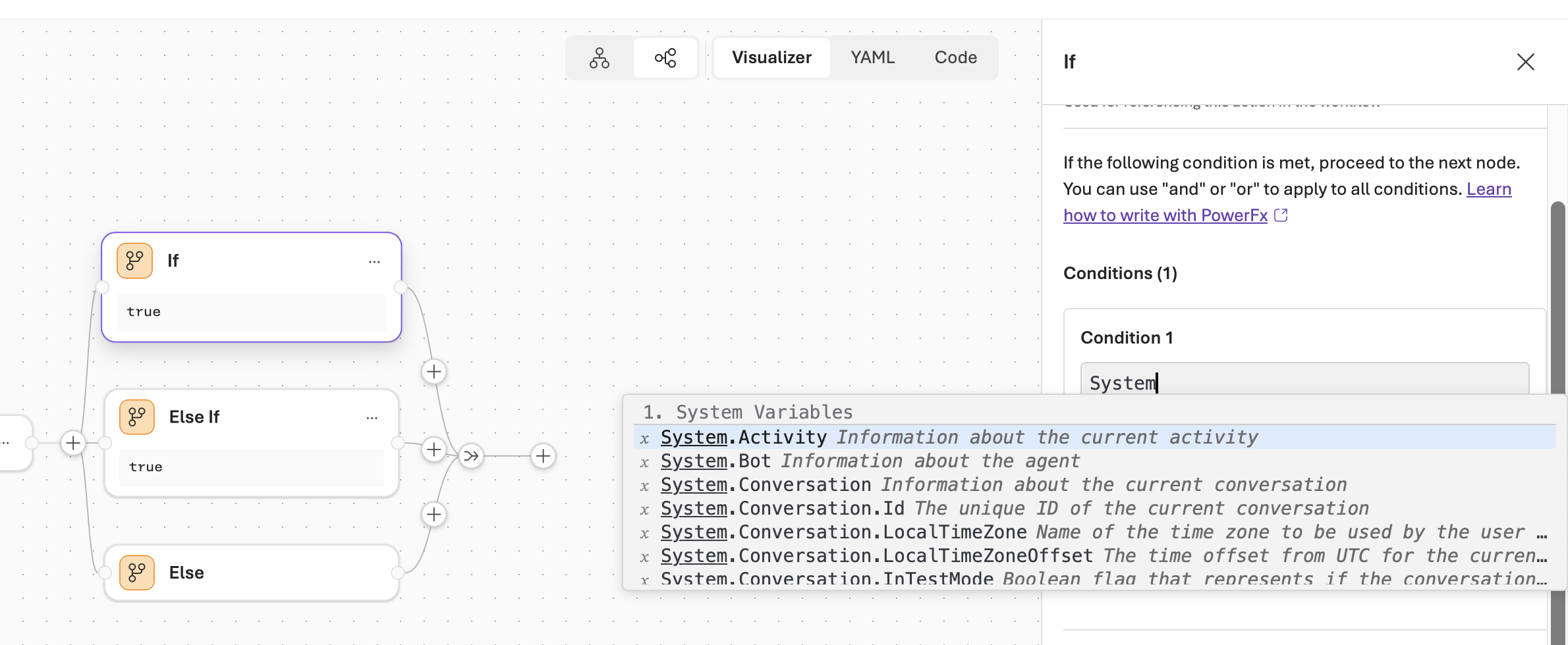 System.in the Condition box to build a condition statement for each if/else branch.Select a Next Action for the next step in the workflow.