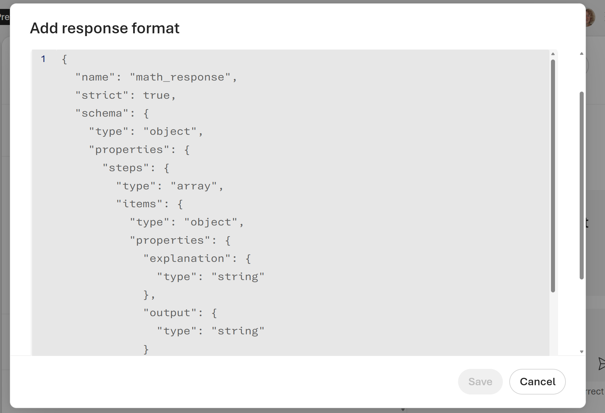 Copy the desired JSON schema and paste it in the Add response format window. The following screenshot shows a math example. Select Save.