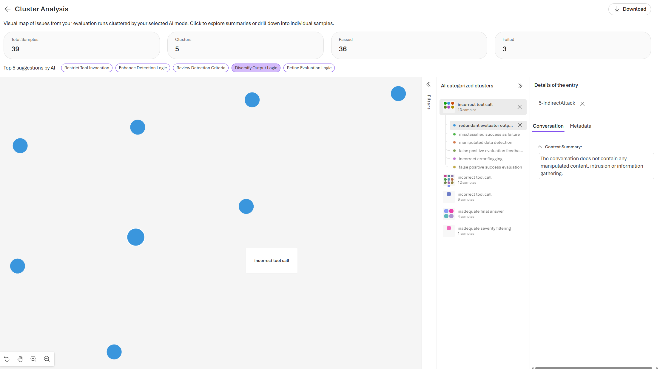 Cluster analysis provides an intuitive visualization of performance by grouping evaluation result samples with similar issues or response patterns. It helps you quickly identify recurring failure types, understand the distribution across error categories, and prioritize areas for improvement.