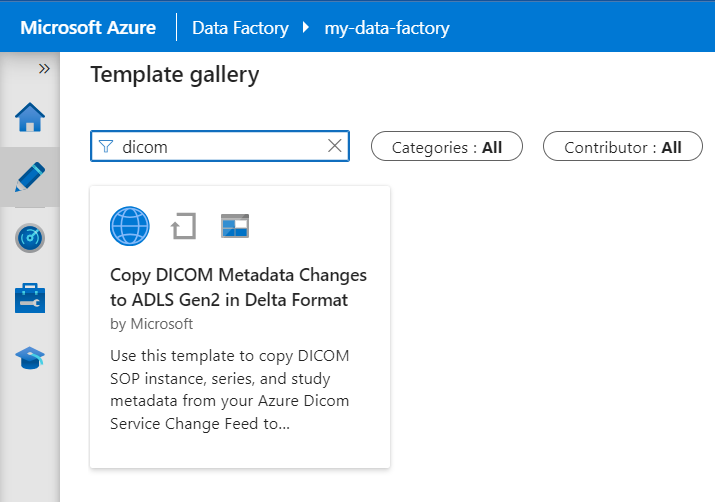 In the Template gallery, search for DICOM. Select the Copy DICOM Metadata Changes to ADLS Gen2 in Delta Format tile and then select Continue.