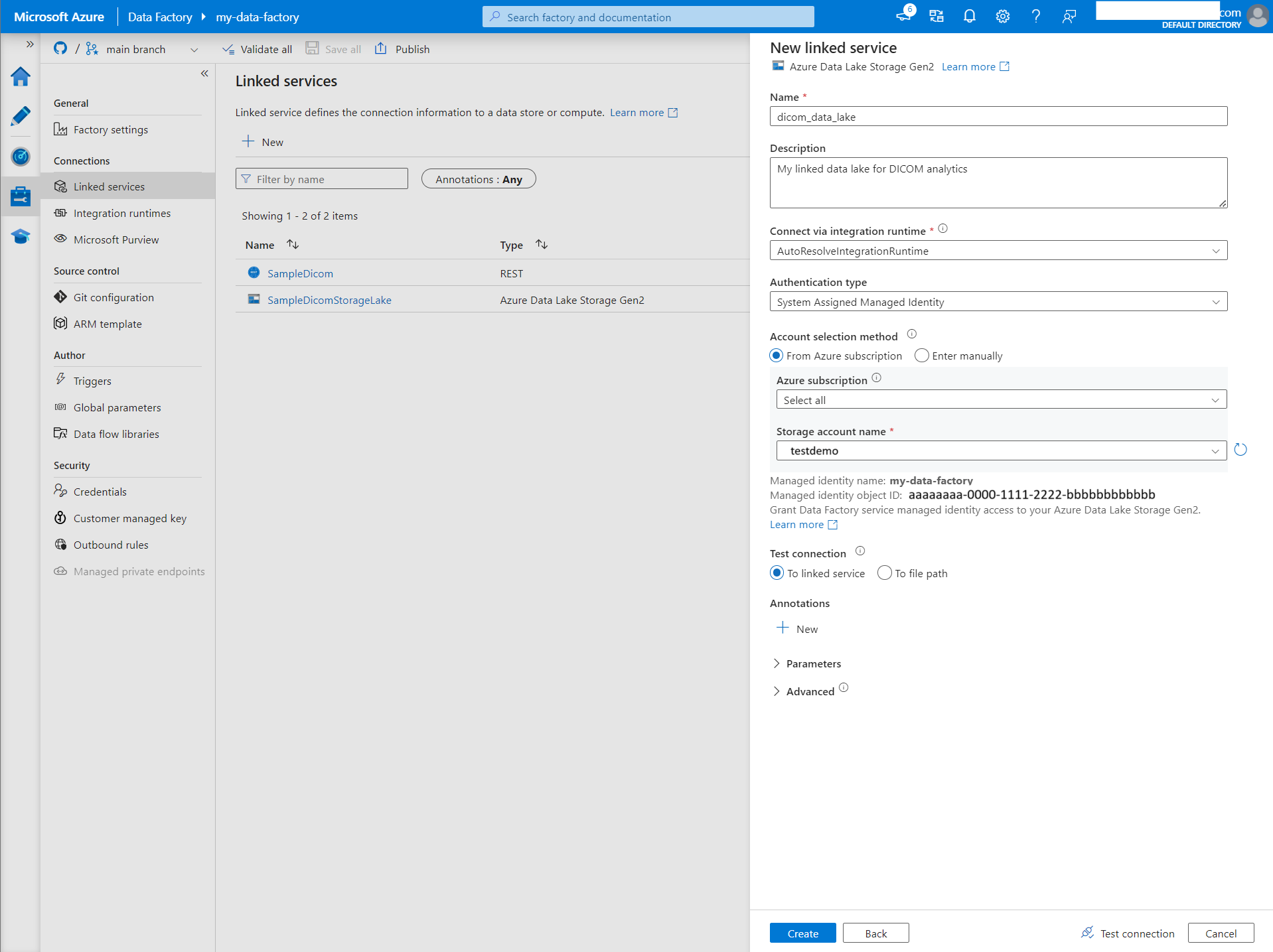 Create a linked service for Azure Data Lake Storage Gen2