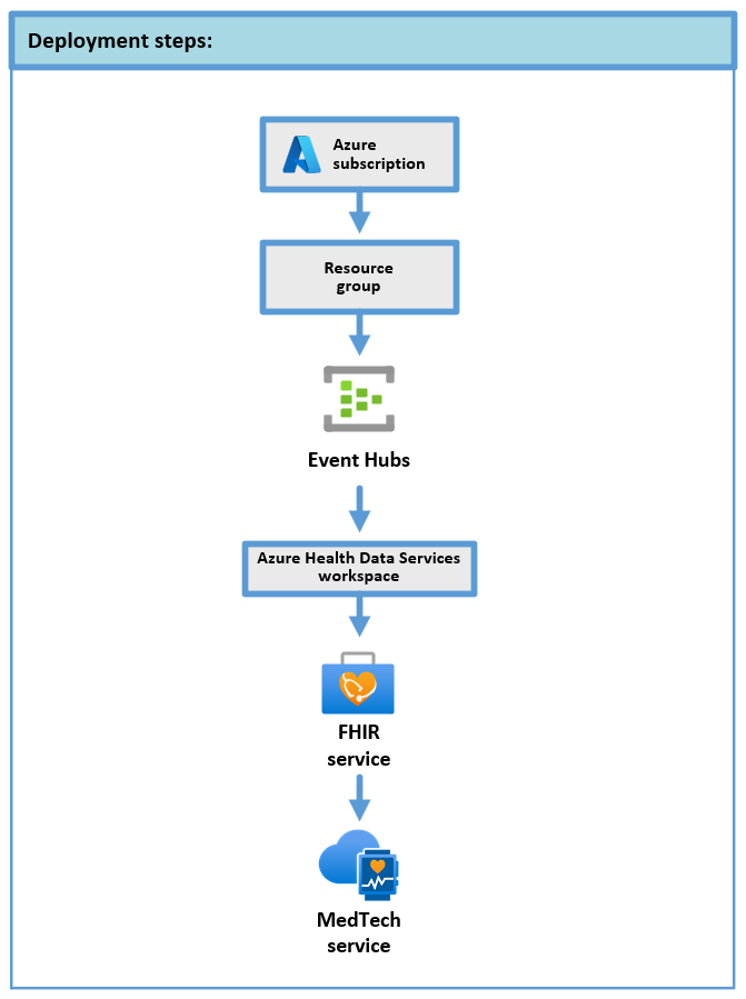 The following diagram outlines the basic steps of the MedTech service deployment. These steps might help you analyze the deployment options and determine which deployment method is best for you.