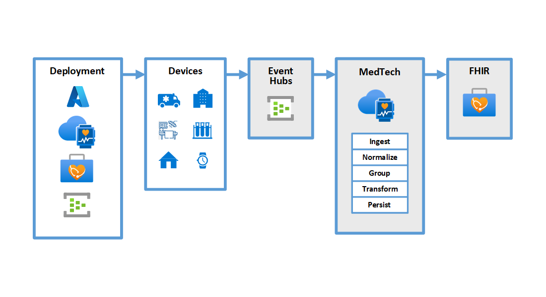 The MedTech service processes device data in five stages: