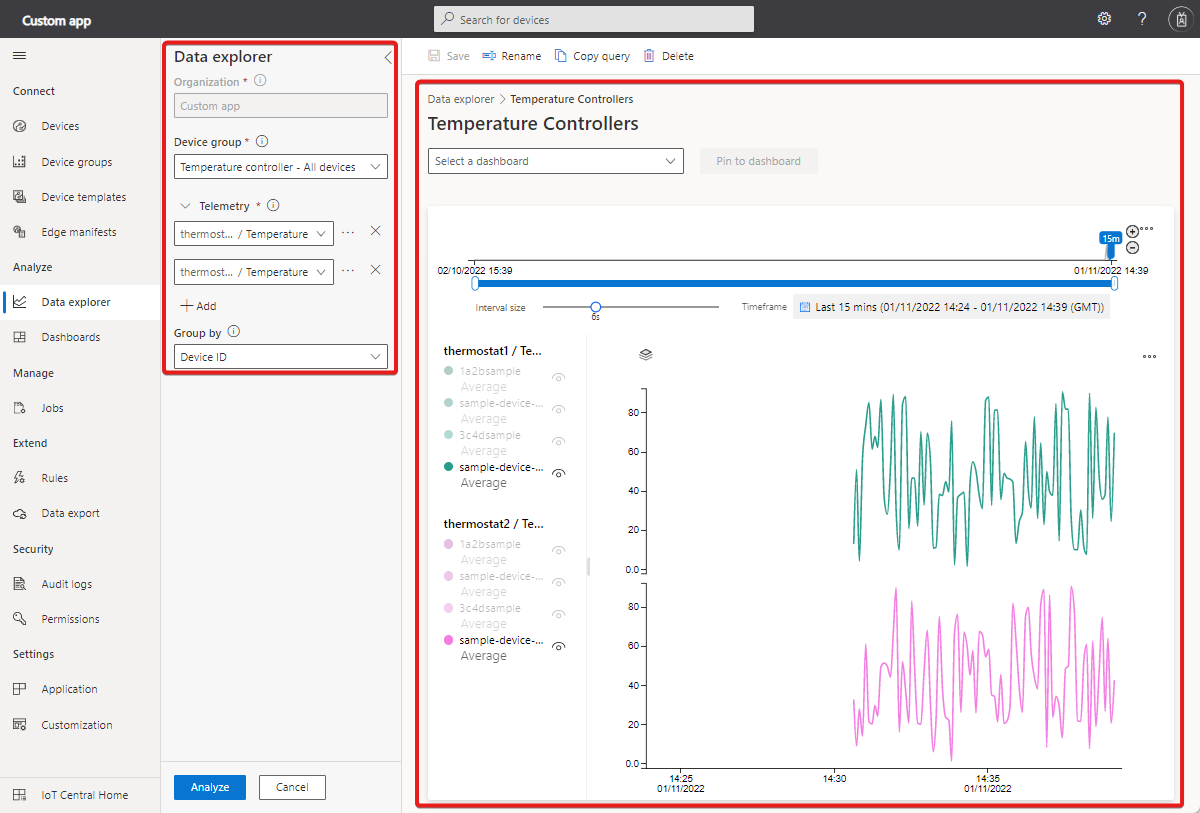 Azure IoT Central provides rich analytics capabilities to analyze historical trends and correlate telemetry from your devices. To get started, select Data explorer on the left pane.