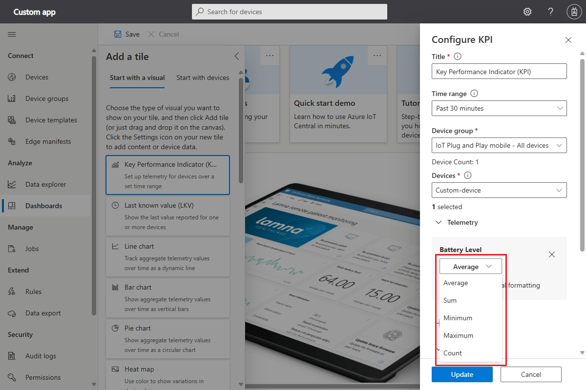 For tiles that display aggregate values, select the dropdown list under the telemetry type in the Configure chart panel to choose the aggregation. You can choose average, sum, maximum, minimum, or count: