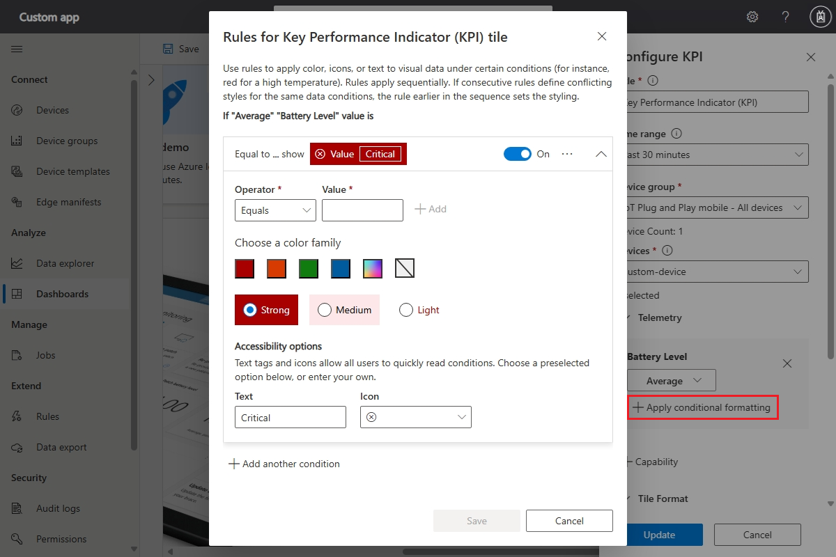 For numeric KPI, LKV, and property tiles, you can use conditional formatting to customize the color of the tile based on its value. To add conditional formatting, select Configure on the tile and then select the Apply conditional formatting button next to the value you want to customize.