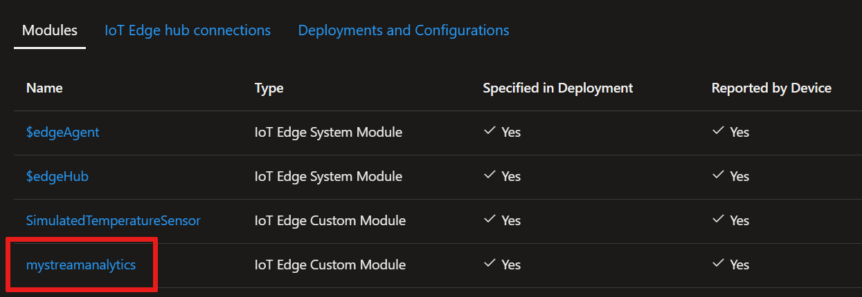 For this tutorial, you deploy two modules. The first is SimulatedTemperatureSensor, which is a module that simulates a temperature and humidity sensor. The second is your Stream Analytics job. The sensor module provides the stream of data that your job query analyzes.