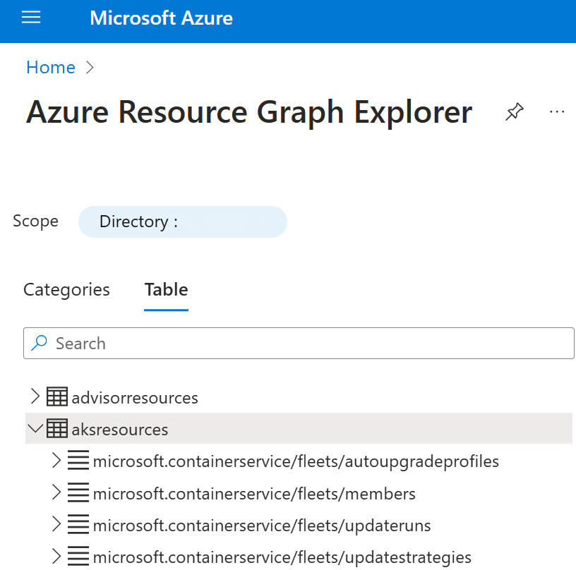 2. Select Table and then expand aksresources. Fleet Manager's resources have the prefix microsoft.containerservice/fleets.
