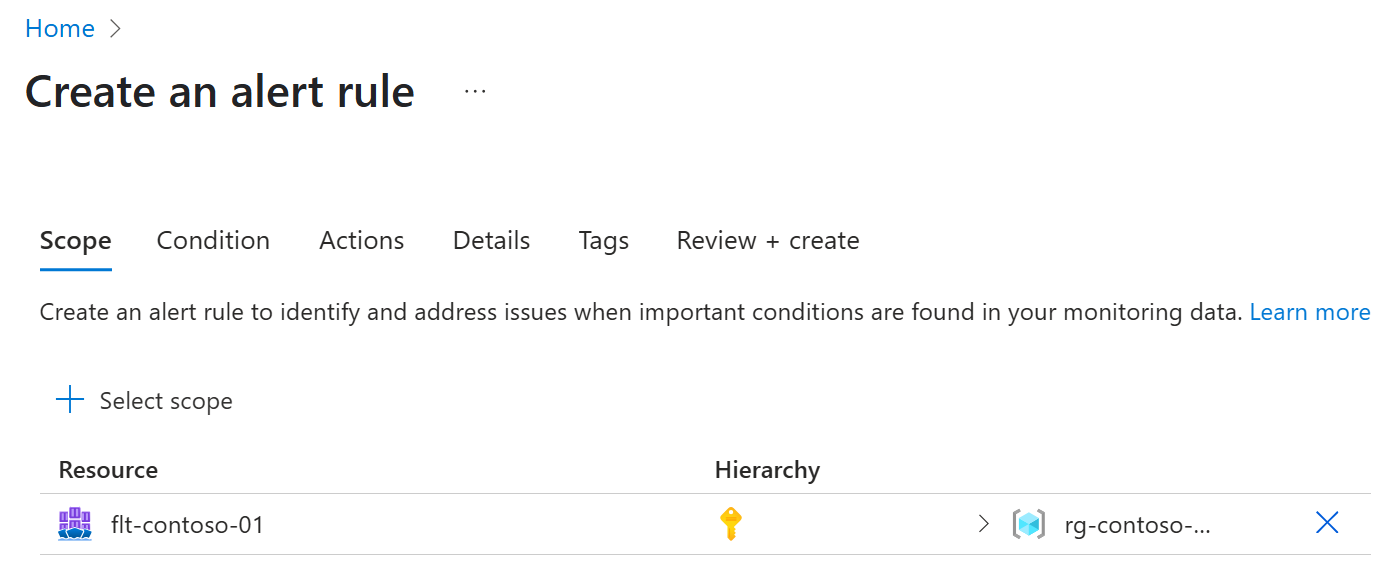 3. On the Create an alert rule screen, select + Select scope and in the Select a resource blade, navigate to your Fleet Manager resource by selecting the Azure Subscription and resource group it resides in.