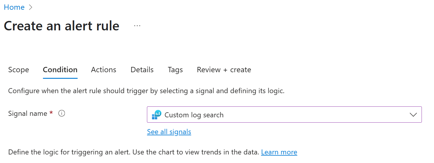 4. Select the Condition tab and in the Signal name select list, choose Custom log search. The Logs blade loads on the right of the screen.
