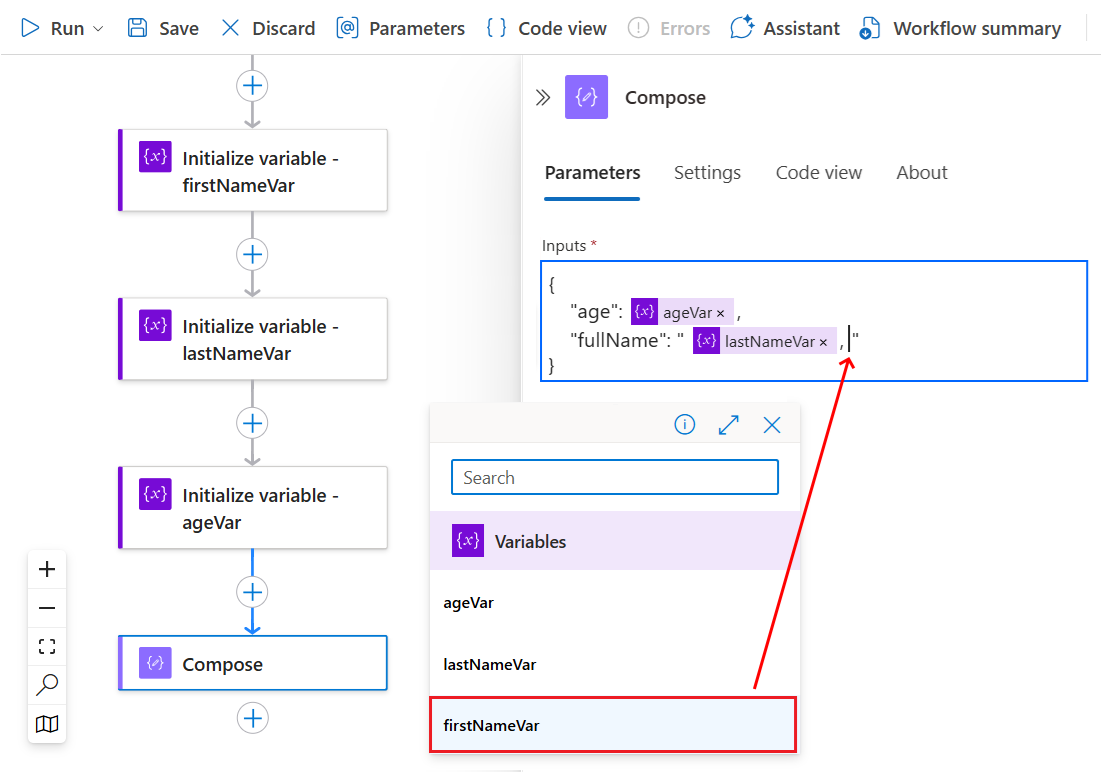 For example, you can construct a JSON message from multiple variables, such as string variables that store people's first names and last names, and an integer variable that stores people's ages. In this example, the Compose action accepts the following inputs: