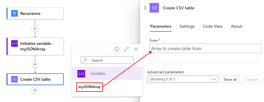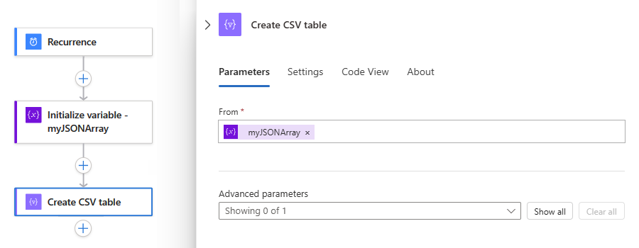 To try the Create CSV table action, follow these steps by using the workflow designer. Or, if you prefer working in the code view editor, you can copy the example Create CSV table and Initialize variable action definitions from this guide into your own logic app's underlying workflow definition: Data operation code examples - Create CSV table. For more information about the Create CSV table action in the underlying JSON workflow definition, see the Table action.