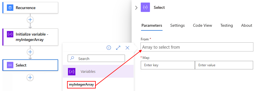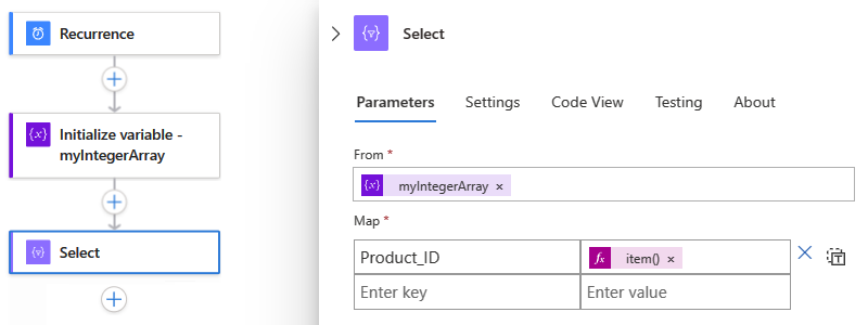 For an example that creates an array with strings or integers built from the values in a JSON object array, see the Select and Initialize variable action definitions in Data operation code examples - Select.