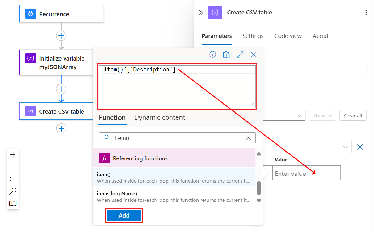 In the expression editor, enter the function named item(), and then select Add.