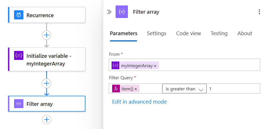 To try the Filter array action, follow these steps by using the workflow designer. Or, if you prefer working in the code view editor, you can copy the example Filter array and Initialize variable action definitions from this guide into your own logic app's underlying workflow definition: Data operation code examples - Filter array. For more information about the Filter array action in the underlying JSON workflow definition, see the Query action.