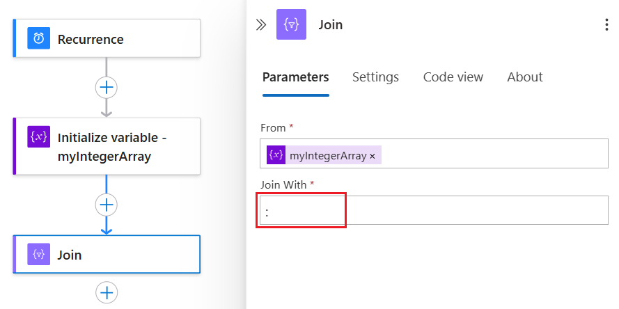 To try the Join action, follow these steps by using the workflow designer. Or, if you prefer working in the code view editor, you can copy the example Join and Initialize variable action definitions from this guide into your own logic app's underlying workflow definition: Data operation code examples - Join. For more information about the Join action in your underlying workflow definition, see the Join action.