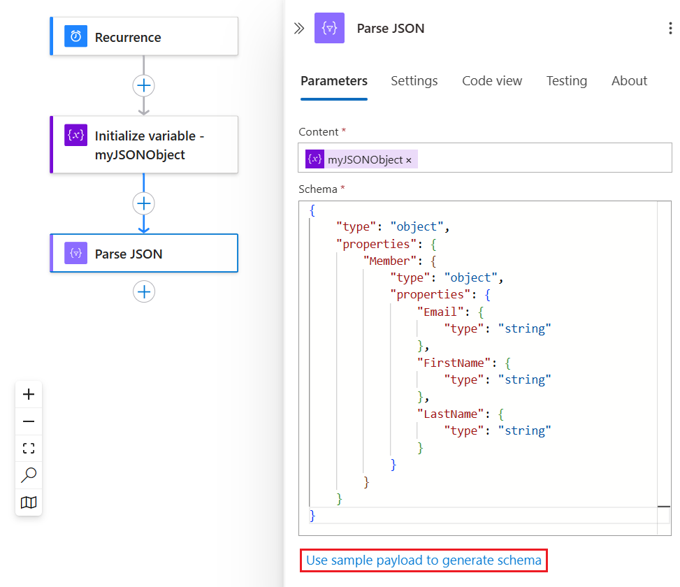 In the Parse JSON action, under the Schema box, select Use sample payload to generate schema.
