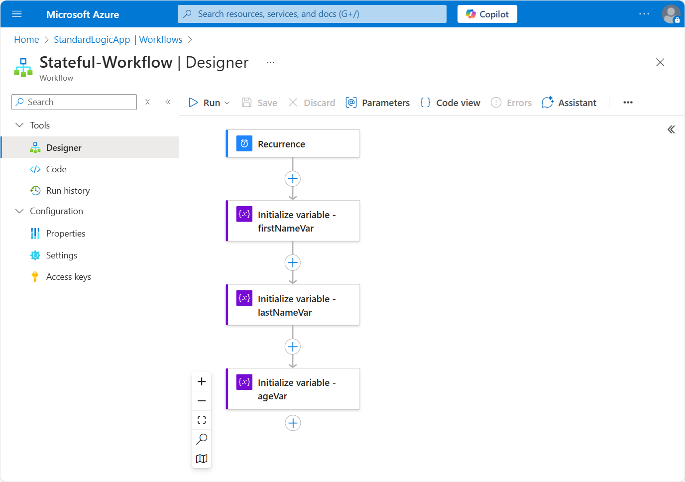 This example uses the Azure portal and a sample workflow with a Recurrence trigger followed by an Initialize variable action. This action is set up to create a variable whose initial value is the following JSON object with properties and values: