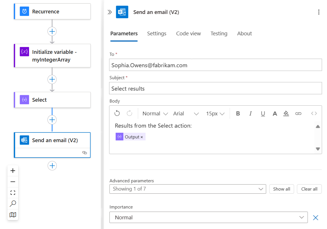 To try the Select action, follow these steps by using the workflow designer. Or, if you prefer working in the code view editor, you can copy the example Select and Initialize variable action definitions from this guide into your own logic app's underlying workflow definition: Data operation code examples - Select. For more information about this action in your underlying workflow definition, see Select action.