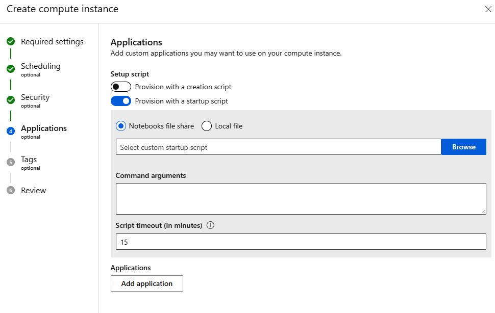 - On the Applications page of the form, toggle on the type of script you want to use: creation script (runs once when creating the compute instance) or startup script (runs every time the compute instance starts).