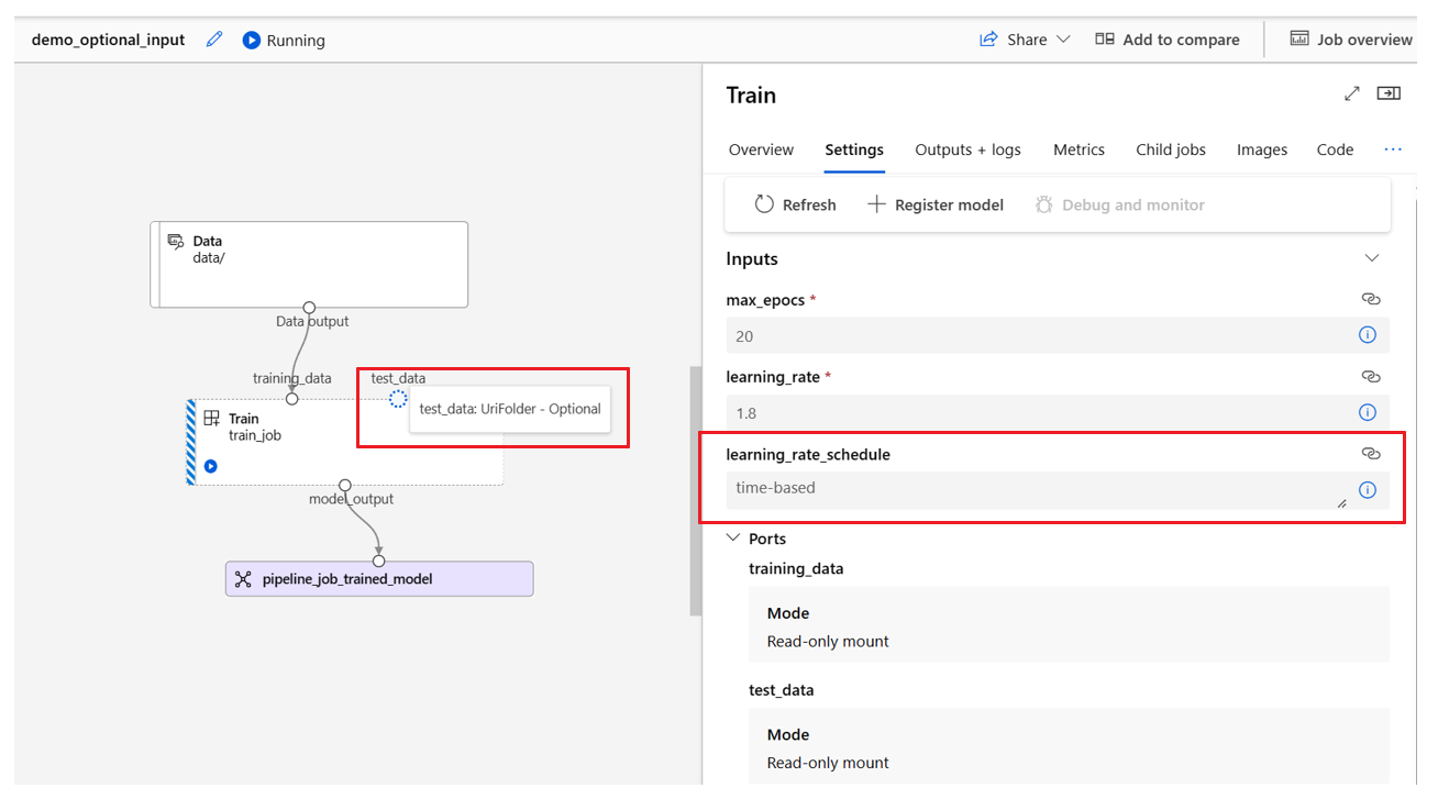 By default, all inputs are required and must either have a default value or be assigned a value each time you submit a pipeline job. However, you can define an optional input.