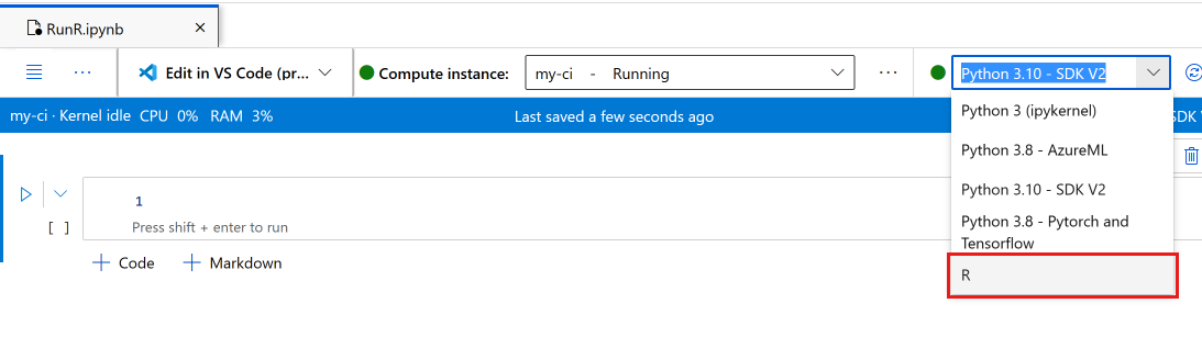 7. On the notebook toolbar, switch the kernel to R.