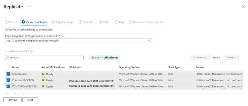 5. In Virtual machines, in Import migration settings from an assessment?, leave the default setting No, I'll specify the migration settings manually.