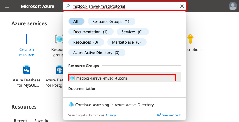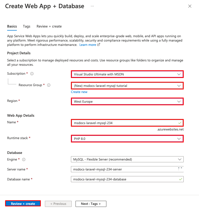 3. Namemsdocs-laravel-mysql-XYZ where XYZ is any three random characters. This name must be unique across Azure.