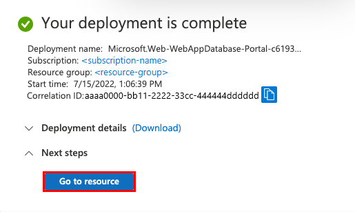 Once deployment completes, select the Go to resource button. You're taken directly to the App Service app.