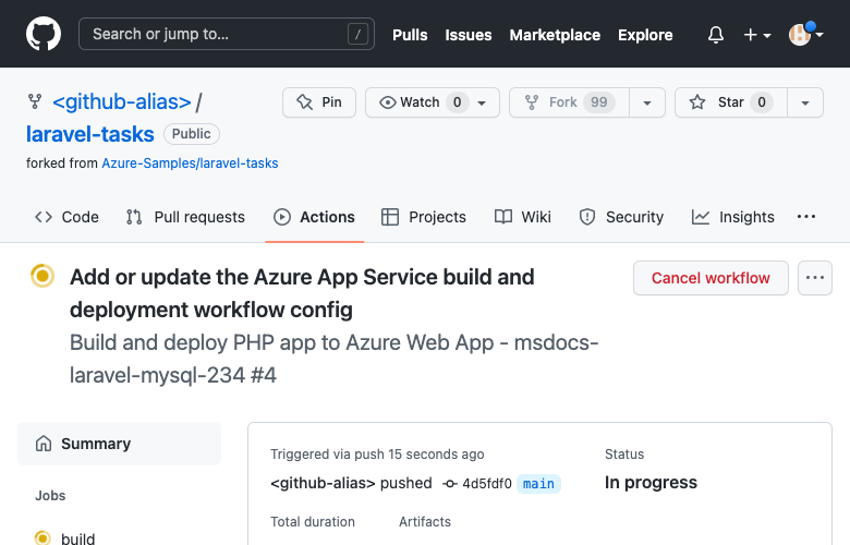You're taken to your GitHub repository and see that the GitHub action is running. The workflow file defines two separate stages, build and deploy.