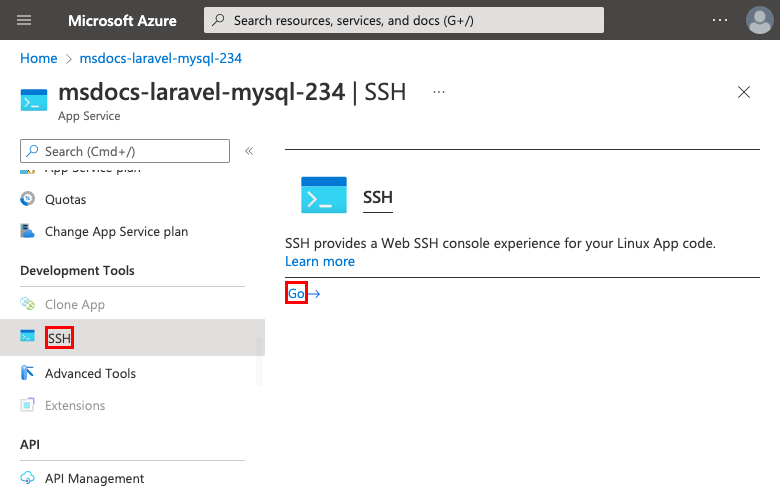 Screenshot showing how to open the SSH shell for your app from the Azure portal.
