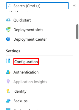 In the App Service page, in the left menu, select Configuration. Screenshot showing how to open the configuration page in App Service.