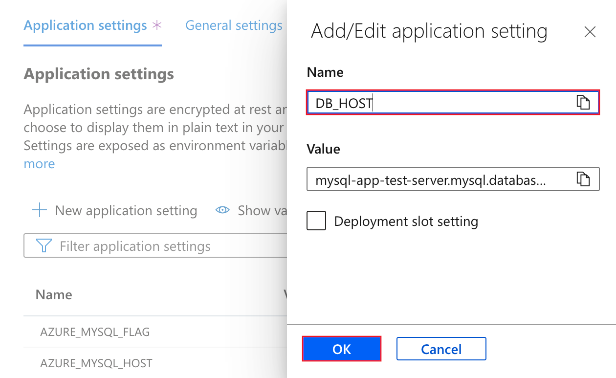 • Configure connection secrets to Azure Database for MySQL Flexible Server using app settings