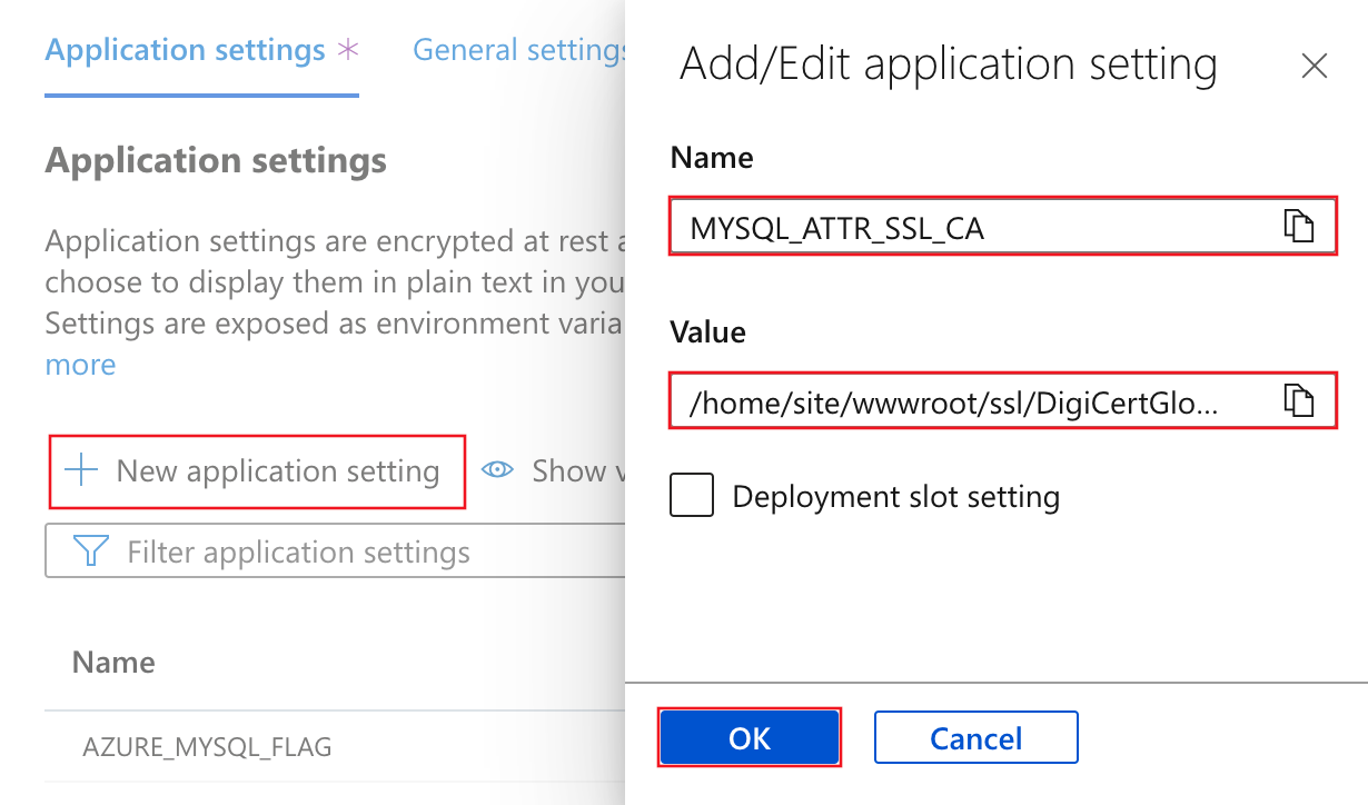 This app setting points to the path of the TLS/SSL certificate you need to access the MySQL server. For convenience, the sample repository includes this certificate.