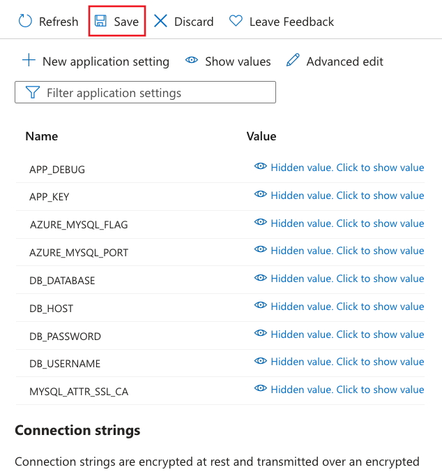 In Visual Studio Code in the browser, open config/database.php in the explorer.In the mysql connection, see that the app settings you created earlier for the MySQL connection are already used (DB_HOST, DB_DATABASE, DB_USERNAME, DB_PASSWORD, MYSQL_ATTR_SSL_CA). Screenshot showing Visual Studio Code in the browser and an opened file.