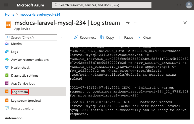 From the left menu, select Log stream.You see the logs for your app, including platform logs and logs from inside the container. Screenshot showing how to view the log stream in the Azure portal.
