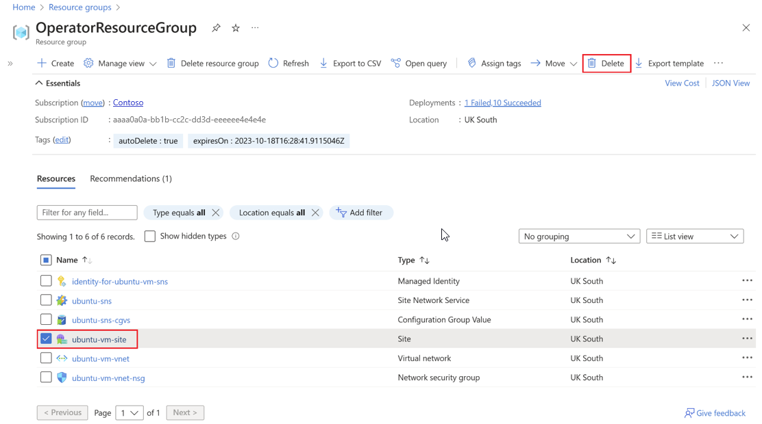Once you have listed the resources, select Delete against the Site Network Service (SNS).